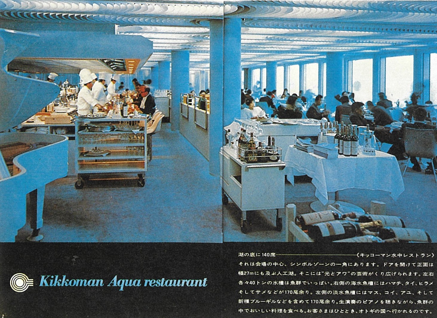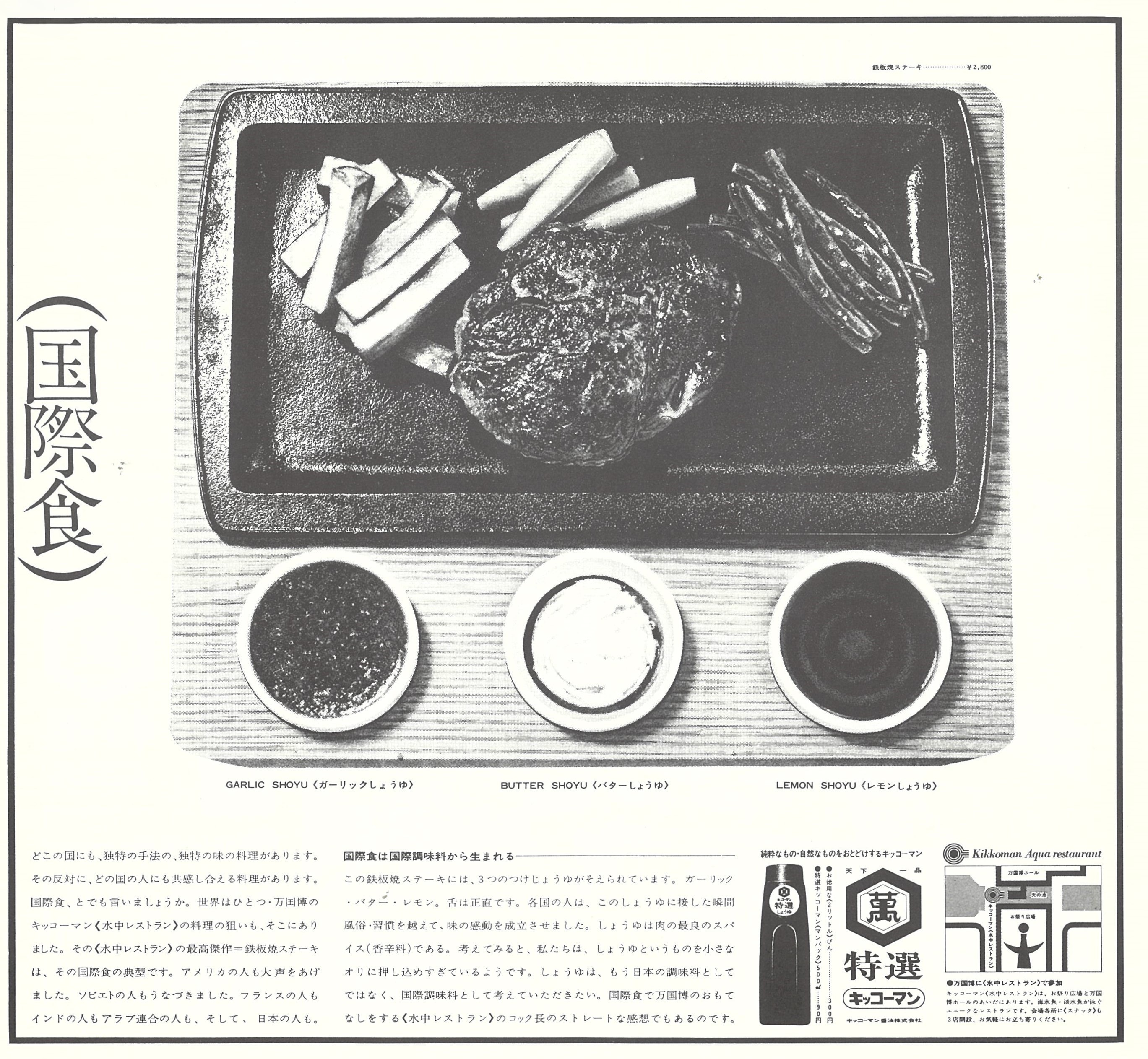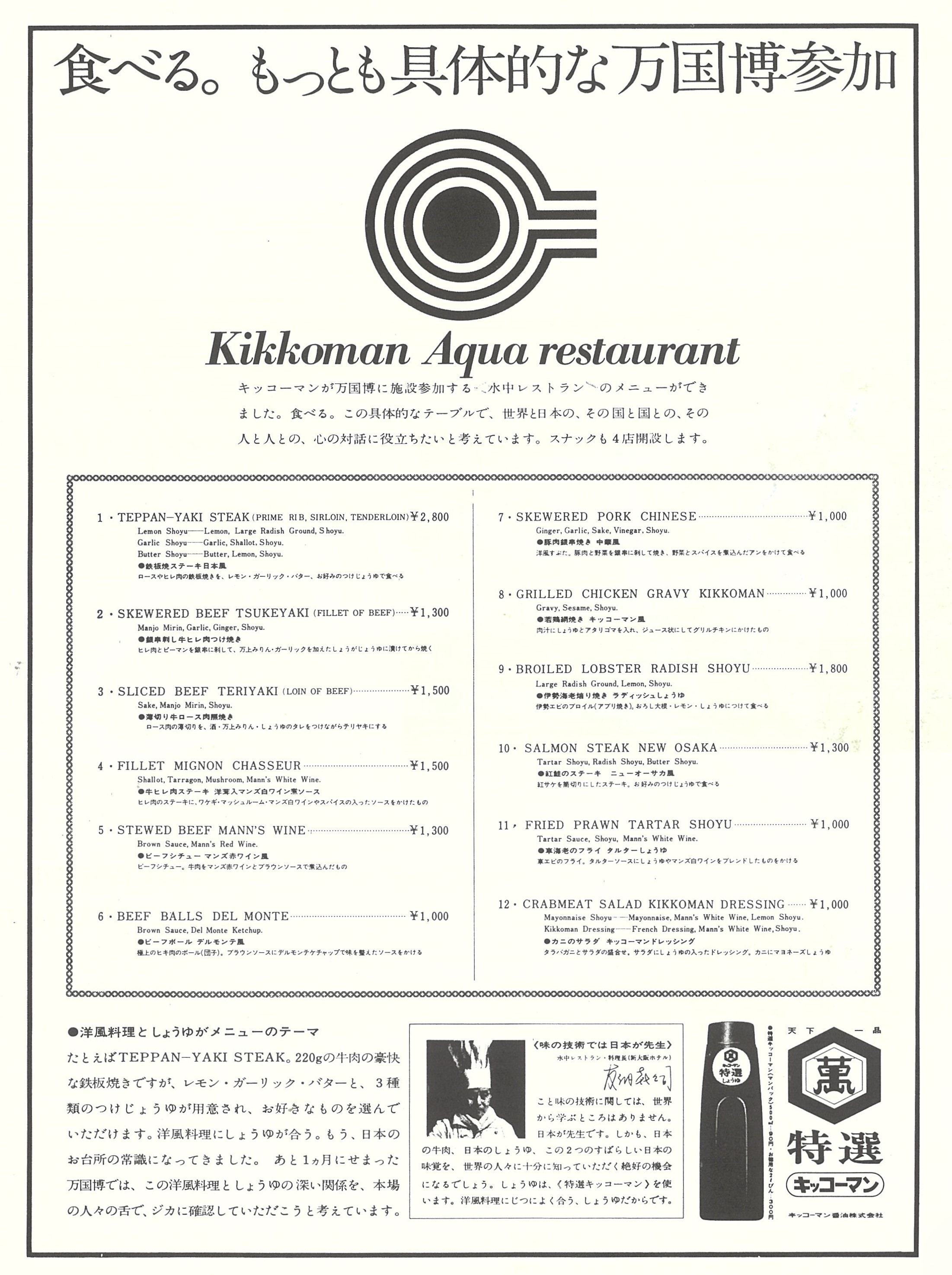 日本で初めて開催された1970年の日本万国博覧会(大阪万博)は世界77か国が出展し、来場者数は約6,421万人に達しました。キッコーマンは、「味の発見」を運営テーマとした5店のレストランなどを出店します。魚が回遊する水槽を巡らせた「キッコーマン水中レストラン」と、4店の軽食店「スナック・キッコーマン」です。会期中に24万人を集めた「水中レストラン」で、とりわけ好評だったのが「鉄板焼ステーキ日本風」で、豪快に焼かれた肉をレモン、ガーリック、バターの3種類のつけしょうゆで味わうメニューでした。「スナック・キッコーマン」は、和食1店、洋食2店、中華1店とテーマ分けされ、しょうゆが和食はもちろん、洋食にも中華にも合う「万能調味料」であることを体現した場となりました。